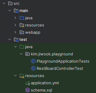 스프링 부트에서는 여러 설정을 간편하게 관리하기 위해서 apllication.properties(or yml) 파일이 존재한다. 해당 파일은 일반적으로 디렉토리의 'main/resources'에만 존재한다. 해당 파일에 여러 설정값들을 작성해주면 스프링부트를 실행할 때 값들이 주입되거나 설정되어 프로젝트 실행에 필요한 요소들을 알아서 채워준다. 그럼 테스트용 DB를 만들고 연결하기 위해선 어떤 과정이 필요할까. 바로 DB를 생성하고 관련된 정보를 저장한 test용 application.properties(or yml) 파일을 작성하면 된다. 테스트용 application 파일의 위치는 'test/resources' 아래에 저장하면 된다.