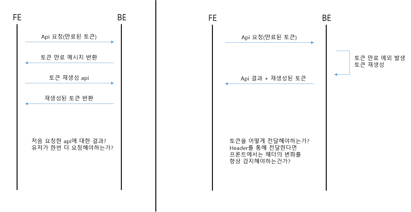 오른쪽 그림은 백엔드 서버 내에서 토큰이 만료되었을 경우 토큰 재생성 로직을 실행하고 api의 결과값과 재생성된 토큰을 반환해주는 방법인데 이 때 어떻게 토큰 정보를 넘길지를 잘 모르겠다. api 결과 DTO에 함께 반환하자니 어떤식으로 설계해야할지 모르겠고, header에 담아서 반환하자니 프론트엔트에서 모든 api요청에 대해 항상 header도 감시하며 처리를 해야할 거같은데 프론트 쪽에서는 어떻게 처리할 수 있는 방법이 있는지 잘 모르겠다.