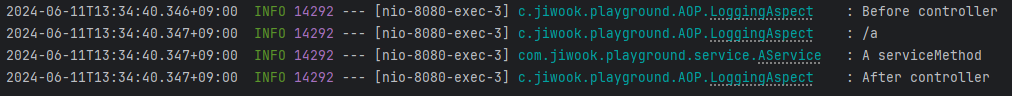 AOP를 이용한 로깅은 컨트롤러에만 적용할 것이기에 서비스 호출 로깅은 직접 매서드 내에 작성해주었다.