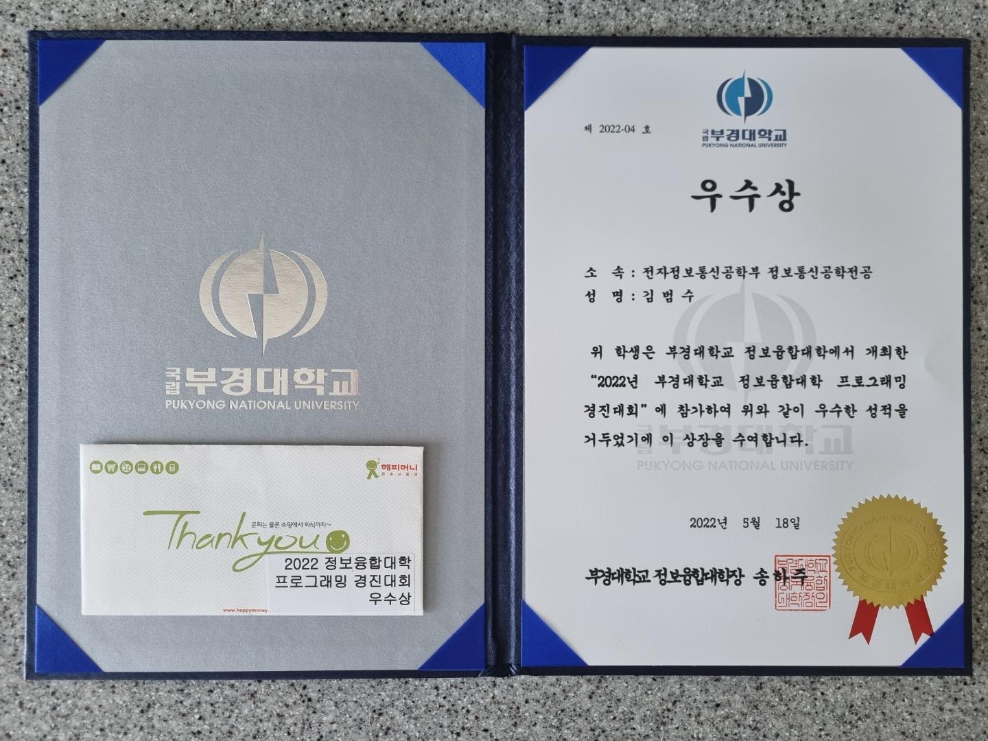 교내에서 열린 프로그래밍 경진대회 우수상을 수상했다. 프로그래머스를 이용하였고 난이도는 Level1 3문제 Level2 1문제 정도였다. 약 50명 정도 참가하였으며 상위 4명이 수상하였다.