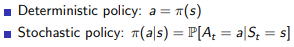 Stochastic policy : S에서 취할 수 있는 A들에 확률에 따라 랜덤 하게 행동한다.
