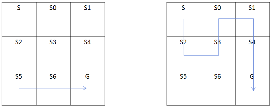 위와 같은 게임이 있다고 가정해보자. 해당 게임은 S에서 시작하여 G까지 가는 것이 목표이며 Reward는 움직임 당 -1을 준다. 원래 같으면 discount vector라고 해서 가중치를 곱해주지만 단순 예시를 위해 제외하고 설명한다(제외한다고는 했지만 discount vector = 1인 경우와 같다). 먼저 왼쪽의 경우에는 V(S6)는 다음턴에 게임이 종료되었기 때문에 받는 reward = 0이다. 따라서 V(S6) = 0이다. V(S5)는 S5에서 S6로 한 번 이동했기 때문에 reward -1을 받게 된다. 그래서 V(S5) = -1이다. V(S2)의 경우에 V5로 한번 이동했으니 reward가 -1이라고 착각할 수도 있지만, Value Function을 구할 때에는 미래에 받는 reward도 함께 계산해야 한다. 그러므로 V(S2) = -2이다.