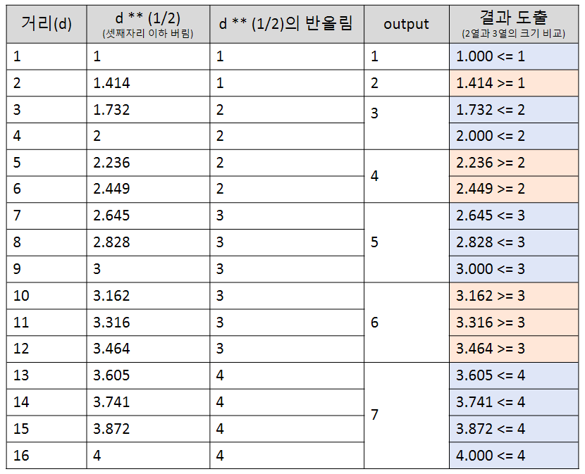 n을 구한 뒤 n의 제곱과 이동거리간의 관계를 이용하여 최종 작동 횟수(출력값)을 구한다.