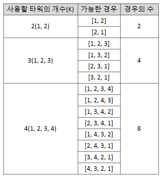 게임 세팅은 서로 다른 높이의 N개의 타워 중 K개를 선택해 원하는 순서로 일렬로 배치하는 것이다. 이때 앞과 뒤에서 바라볼 때 모든 타워가 최소 한 번은 보여야 한다. 즉, 어떤 타워에 대해서 그보다 높은 타워가 그 타워의 앞쪽과 뒤쪽에 모두 존재하면 안된다는 것이다.