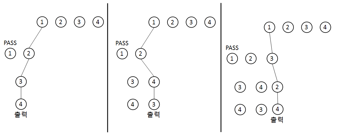 한 단계 깊어질 때마다 solution함수를 재귀함수로 사용하여 최종 단계까지 도착한 뒤 출력하고나서 그 다음 숫자로 넘어가게 된다.