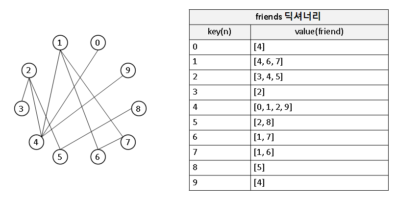 우선 5 - 8 번줄을 통해 총 N명 (0 번 ~ N-1 번) 까지의 관계를 정리한다. 그 결과 friends라는 딕셔너리에는 n번째 사람과 친구인 사람들이 정리될 것이다.