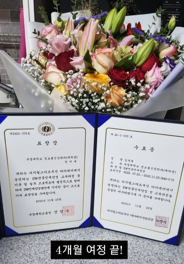 4개월 간의 과정이 끝나고 2022년 11월 23일 수료를 했다. 전날에 코로나 확진판정을 받아서 상을 직접 받지 못해 아쉬웠던 것을 빼면 후련하다.