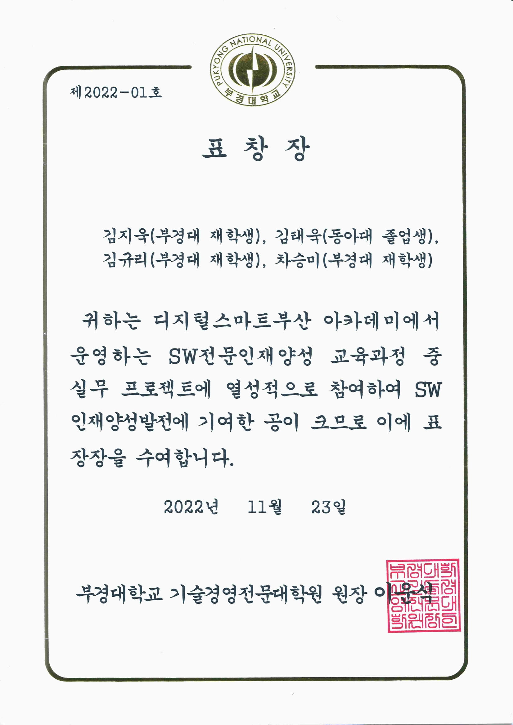 약 2개월의 교육 과정이후 두개의 프로젝트에서 팀장을 맡으면서 노력한 결과 그 공로를 인정받아 개인상을 받게 되었다. 1등상인 '부산시장상'을 놓친게 아쉽지만 그래도 2등 상이라도 받아서 나름 만족스럽다.